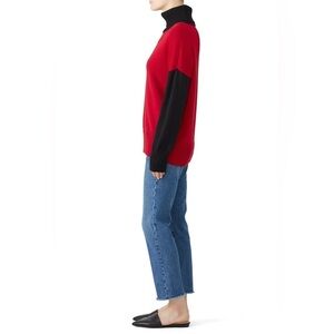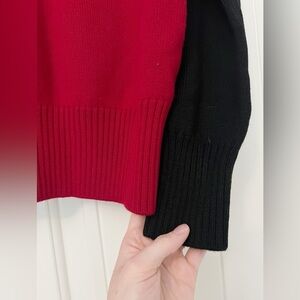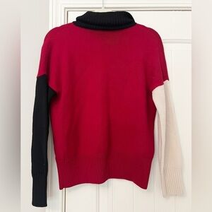 Red, black & white knit (100% Virgin wool). Sweater. Long sleeves. Turtleneck. 27" from shoulder to hemline.