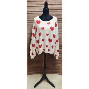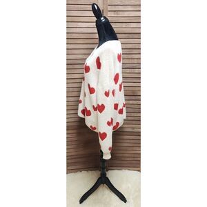 Fuzzy Heart Dropped Shoulder XL Sweatshirt Super Soft Long-Sleeve Oversized White & Red