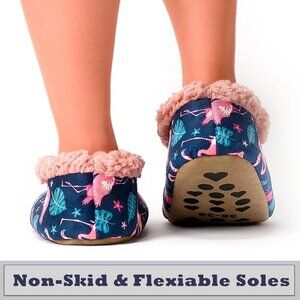 Features: Plush sherpa lining and a faux suede sole with non-slip grippers make these slippers perfect for cold seasons. They offer a snug fit, adorable flamingo print, and a lightweight, foldable design for easy slipping on and off or packing for travel.