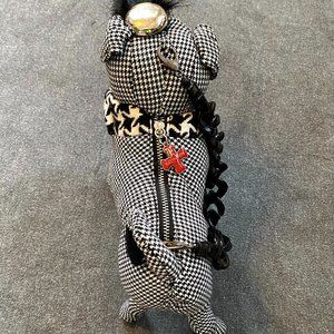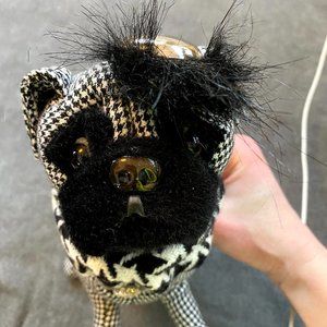 Never been used (internal stuffing still inside) but tags have been removed. Box included. Comes with an extra plastic link. Legs are posable. Houndstooth print.