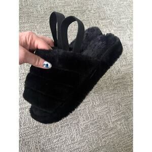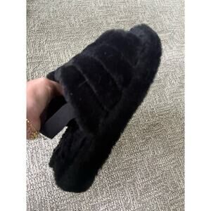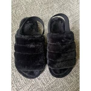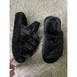 Fuzzy black open toe slipper elastic heel strap women’s 9