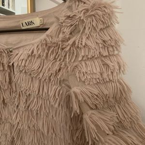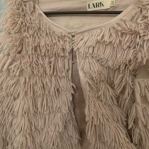 A fuzzy layered jacket. Very soft, it’s like a shag carpet :) It has little hooks to wear it closed if you’d like.