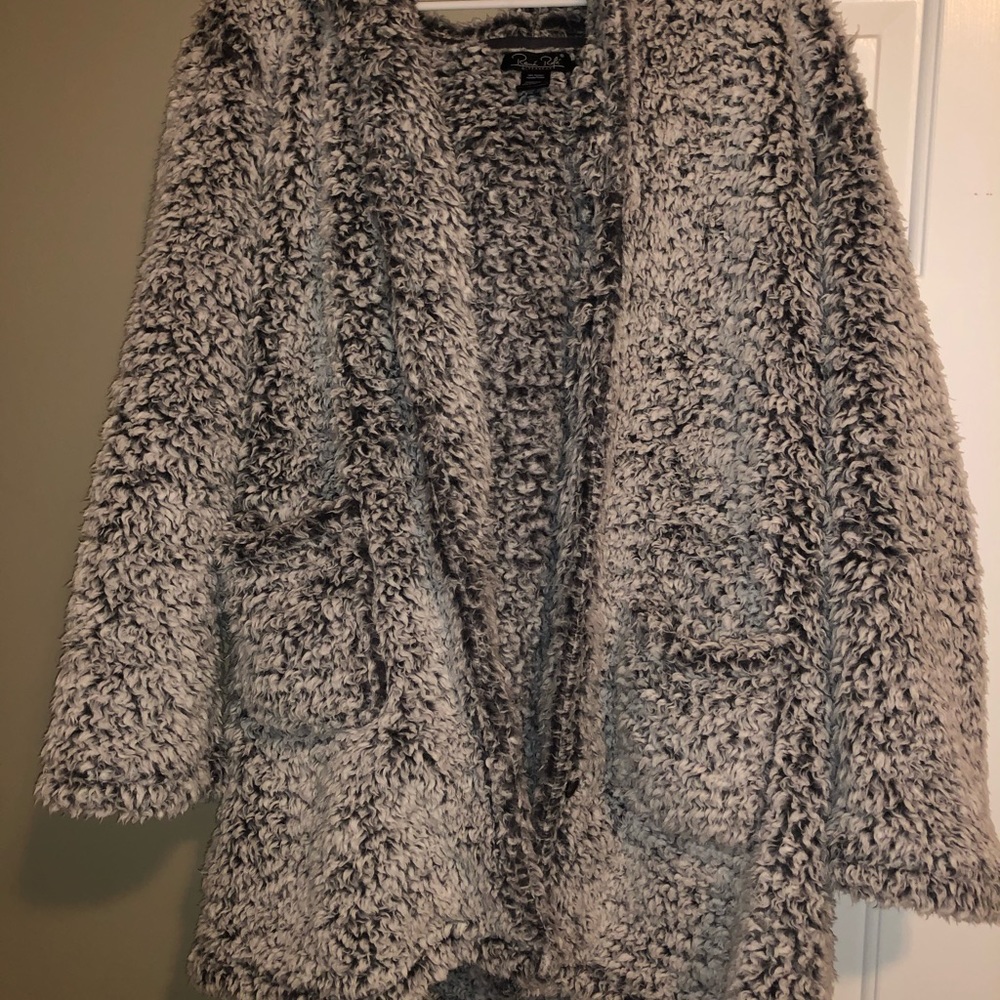 Fuzzy black and white jacket with hood, pockets, and buttons