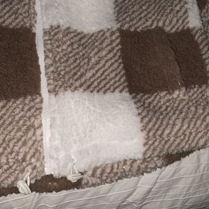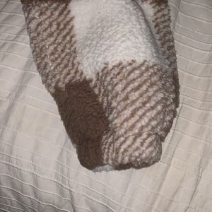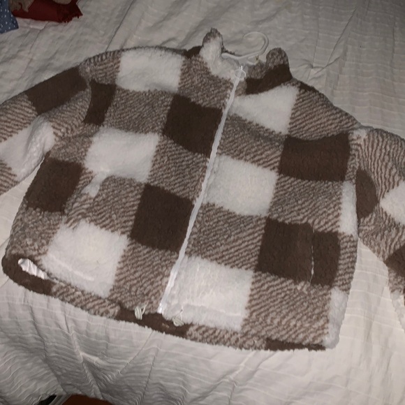 Plaid fuzzy jacket light brown and white, size XS, has adjustable bottom strings and 2 pockets, the neck is high good for cold
