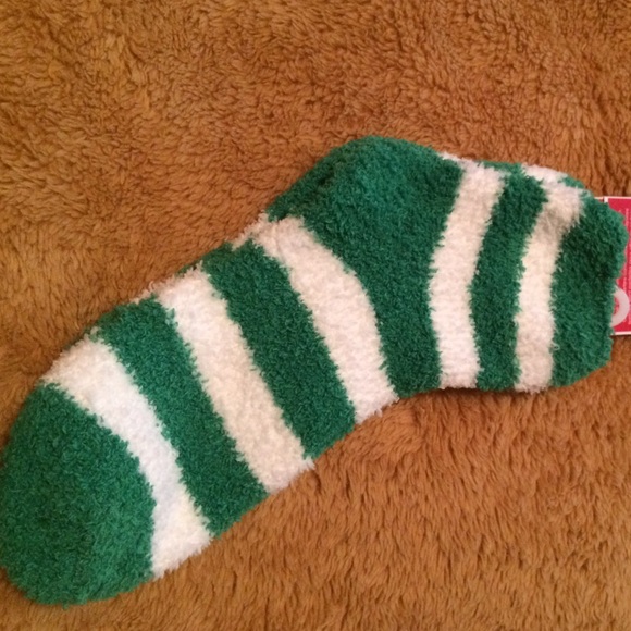 Fuzzy green and white striped socks. Never used.