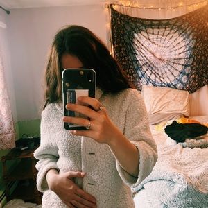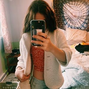 *marked as large but fits small/medium.* Super soft and warm fuzzy white jacket. Totally trendy and comfy