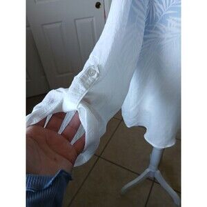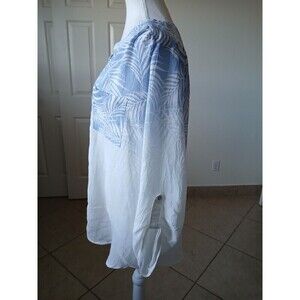 This Fyve women's button-up shirt in size 1X features an ombre design in shades of blue and white, perfect for a tropical or coastal theme. With a V-neckline, roll tab sleeves, and a lightweight material blend of 65% polyester and 35% rayon, this shirt is ideal for travel or casual wear during the summer or spring seasons. The breathable and easy-care fabric makes it a comfortable and stylish choice for a vacation or seaside outing.