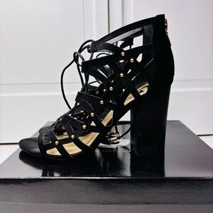 Details: G by Guess Juto5 black lace/tie up sandals -Gold zipper on heel