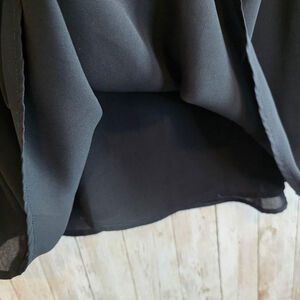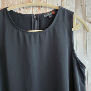 This is a pre-owned black sleeveless top by G by Guess, size S/P. It features a round neckline and a concealed zipper closure at the back. The top is made of 100% polyester.. The hemline has a sheer chiffon-like layer. There are no visible stains or tears.