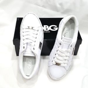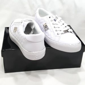 Aim high with your street-inspired style with the faux-leather G by GUESS® Gretchy lace-up sneakers. Soft man-made lining and a padded footbed for added comfort. Durable rubber outsole. Imported. NEW-IN-BOX. Color: White Multi LL. Size: 8M. (Note: Box cover is slightly damaged at one corner)