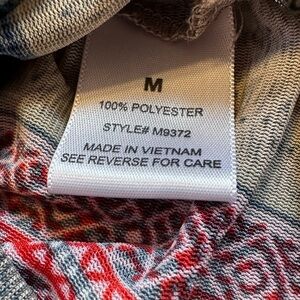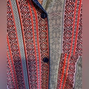 Maxi length, multicolored ( gray, blue reds) stripes, sleeveless, buttons almost all the way down. Has slits on either side