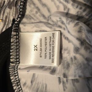 • Outer layer: patterned black, gray & white overlay with open neckline, length 28”