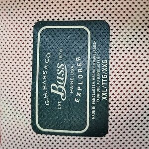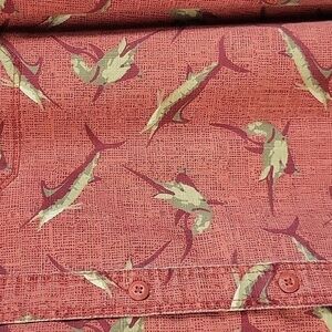 G. H. Bass & Co, Bass Explorer men's short-sleeved, button-down shirt with reds and tan swordfish pattern, size XXL.
