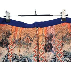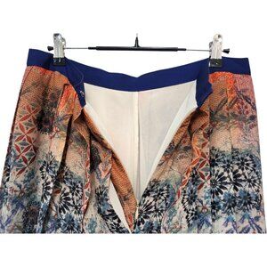The striking patchwork print mixes bohemian and modern influences in a palette of rust, navy, and cream — a timeless statement piece that flatters effortlessly. Pair it with a crisp button-up for polished chic, or a simple tank and slides for relaxed elegance.