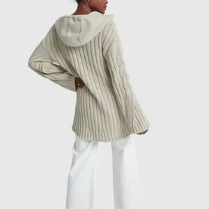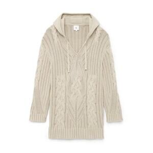 This long, tunic-style sweater is crafted in a chunky cable-knit, featuring a relaxed hood and V-neck with drawstring ties. The intricate cable patterns and soft, neutral tone create a timeless aesthetic. Perfect for layering after a day at the beach or adding warmth to everyday outfits. A go-to piece for effortless style.