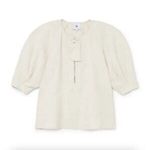Cut from a drapey viscose blend, Sylvia has an easy body and dramatic elbow-length puff sleeves that gather elegantly at the cuffs. But before you go thinking it’s hyperfeminine, zoom in on the neckline: It’s finished with cool utility-inspired details, like a half zip, a button tab, and covered snaps. Pair this with structured skirts, high-waisted trousers, off-duty denim—it’s all fair game.