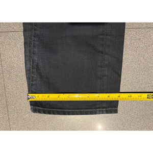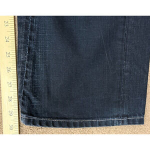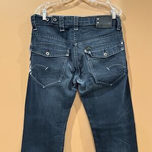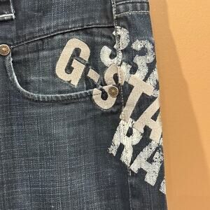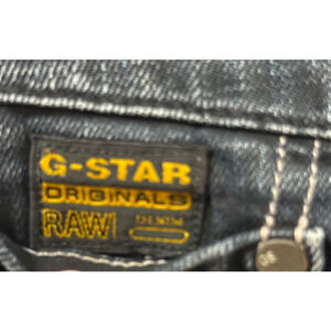 The product is a pair of G STAR Raw Jeans for men in the Radar Cover Loose Country Embro style. These jeans feature a solid dark blue color with an embroidered logo, a mid-rise fit, and a loose style. Made of denim fabric with a raw wash, these jeans are machine washable and easy to care for. They have a button closure, 5-pocket design, and are suitable for all seasons. The waist size is 34 inches, and the inseam is 30 inches, making them a versatile and comfortable choice for men's everyday wear. Tag is cut and measurements are shown in photos
