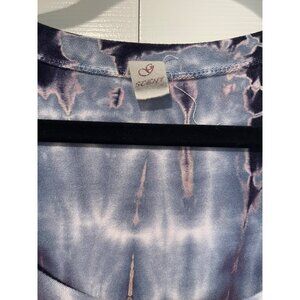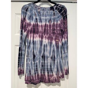 Cute, soft, and comfortable tie-dye top with a pattern composed primarily of blue and purple. Indie, alternative, feminine, casual. In good pre-worn condition with typical wear. No stains, holes, or tears noted. No material/care tag.