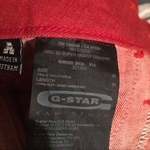 Women's red G Star jeans size 30 worn only one time fits true to size. Skinny leg fits entire leg