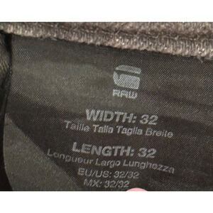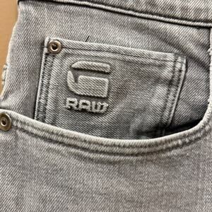 The product is a pair of men's G-Star Raw jeans in a size 32 x 31 with a tapered leg design. These gray jeans feature a button fly closure, stretch material made from elastodiene and cotton, and are machine washable. They have a solid pattern with embroidered logo accents, making them a stylish and comfortable choice for all seasons. The G-Star 3301 product line ensures quality and durability, while the versatile design makes them suitable for various occasions.
