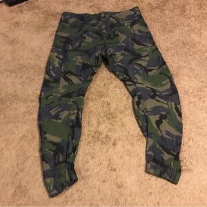 Camo,Cargo style, pockets,tapered legs, Jogger measurements are waist is 20 inches and inseam is 28 inches and rise is 11 inches
