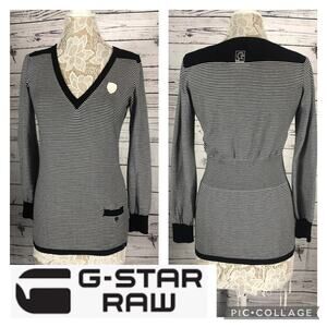 G - Star Raw V neck sweater striped black & white long fitted size large