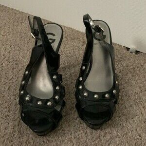 Black patent leather with studs small platform open toe sling back with adjustable strap