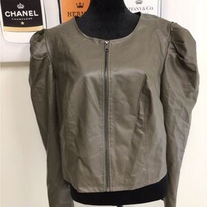 Stylish khaki leather jacket with structured shoulders. Perfect for a modern look.