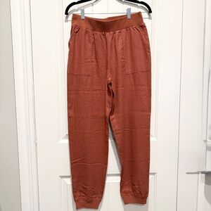 Chic linen blend joggers with a comfortable fit and Beautiful terracotta color. Elastic waistband. Pockets. Perfect for everyday style.