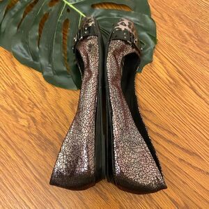 Ballet flats have a metallic crackle pattern. Toes are leopard print. Black buckle hardware across toe.