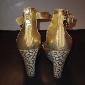 Ankle strap gold wedge sandals. Heel has the "G" logo all over.