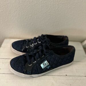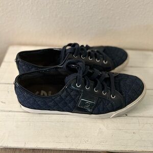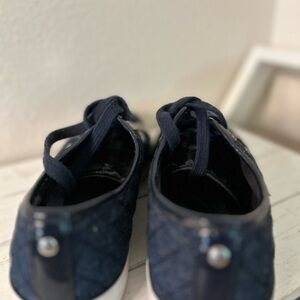 Navy quilted design with glossy accents. Comfortable and stylish for everyday wear.