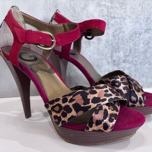 G by Guess Open Toe Red Suede and Leopard Print Heels Gold Buckle Size 6