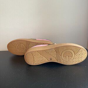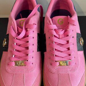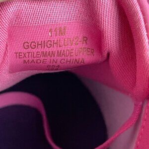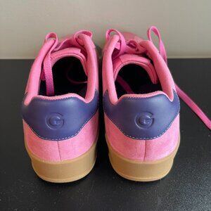 Stylish pink sneakers with black accents. Comfortable and trendy design. Perfect for casual wear.