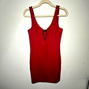 G by Guess Red Bodycon V-Neck Sleeveless Mini Dress Silver Hardware At Neck