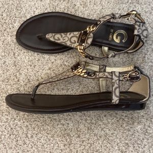 Worn once, Chocolate brown, gold and tan dress sandals by G by Guess. Adjustable straps with gold metal accents and guess name plate,size 8 from a smoke free, clean home