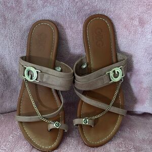 Chic tan sandals featuring a stylish chain detail. Perfect for everyday wear.
