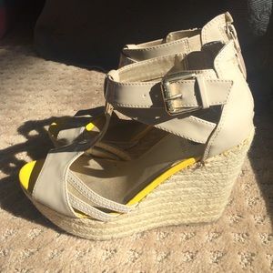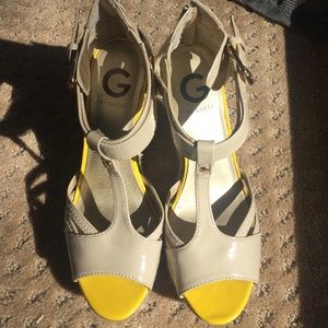 G by Guess Tan Yellow Peep Toe Straw Wedges