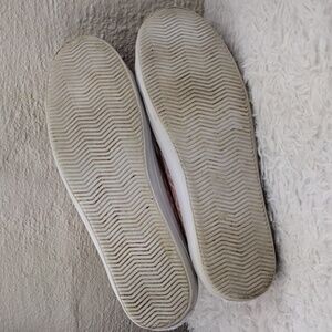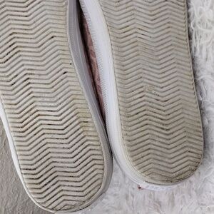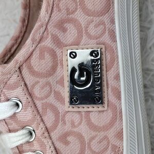 G by Guess Tannur Women's Pink Fabric Logo Embroidered Look Upper Round Toe Low Top Six Eyelet Lace Up Casual Sneaker Shoe. Rubber Textured Sole. Light Cushion Fabric Footbed. Silver Logo Lace Charm. Silver Logo Side Hardware. Footbed Size Sticker Mark. Sole Staining. Size 8M Color May Vary Due To Lighting.