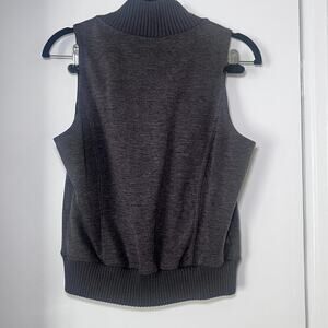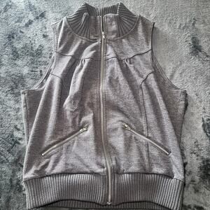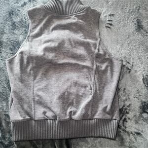Pre-owned G by Guess sleeveless zip-up vest in heather gray, size XL. Features ribbed high neck and hem, silver-tone zipper closure, and zip pockets. Casual, versatile style. Excellent condition.