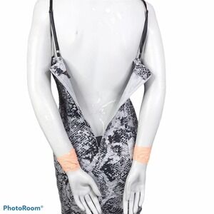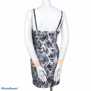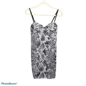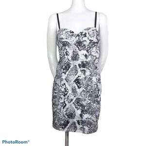 G by Guess snakeskin Bodycon mini dress. White, black, and grey monochrome snakeskin print dress. Padded bust. Sweetheart neckline. Adjustable spaghetti straps. Zip up back closure.