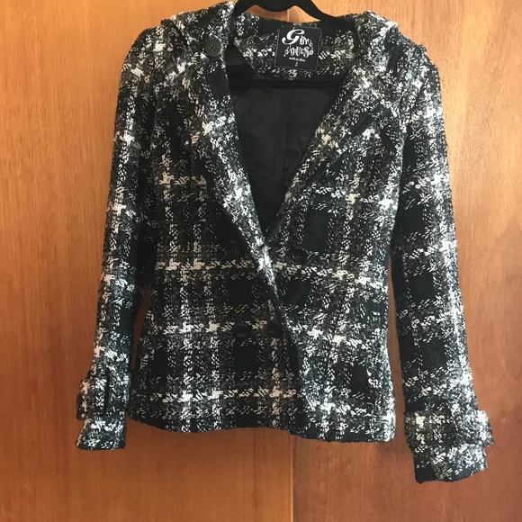 Double breasted tweed jacket/coat, button closure hooded, size small. Great condition