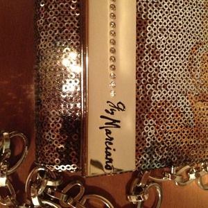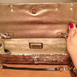 G by Marciano Gold Silver and bronze sequence arranged in a flower pattern. Gold and leather shoulder strap.