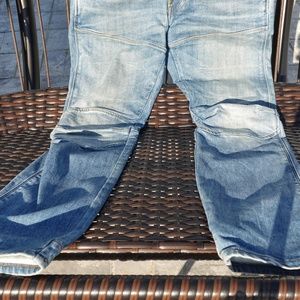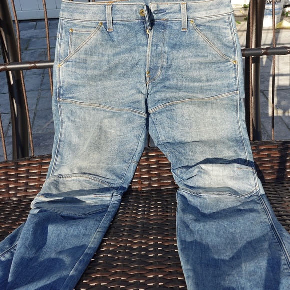 G star Raw 5620 3D Slim Light jeans with yellow hardware and stitching very small stain at the front of jeans not even visible No zipper knee Feature