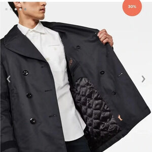 This denim peacoat is designed in a classic look with technical features. At the lower cuffs an elasticated tape is set, which allows you to tighten it. Heavy-duty stitching is set along the edges. The collar can be held upwards by use of the throat latch stored away at the inside of the coat. Inside, a heat pressed lining is executed in a G-Star RAW pattern and offers an inner pocket and a copper willow tree print. At the backside of the collar a GS RAW embro is added.