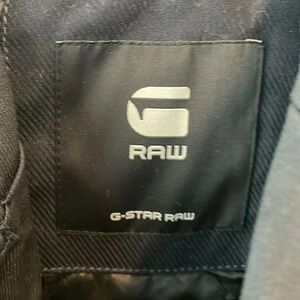 This denim peacoat is designed in a classic look with technical features. At the lower cuffs an elasticated tape is set, which allows you to tighten it. Heavy-duty stitching is set along the edges. The collar can be held upwards by use of the throat latch stored away at the inside of the coat. Inside, a heat pressed lining is executed in a G-Star RAW pattern and offers an inner pocket and a copper willow tree print. At the backside of the collar a GS RAW embro is added.