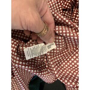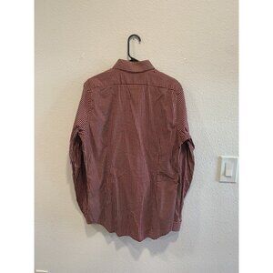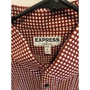 The product is an Express extra slim men's dress shirt in size L, with a polka dot pattern and a wine color that features long sleeves, a button closure, a high neckline, and a slimming fit. Made from cotton fabric, this button-up shirt from the brand Express is designed with a button-down collar style and is ideal for a casual yet stylish look. Perfect for men who are looking for a distinctive and colorful addition to their wardrobe.