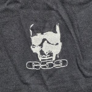 Design details: Small embroidered skull-with-horns graphic over a chain reading "G59" near the front hem; printed neck label with G59 skull graphic