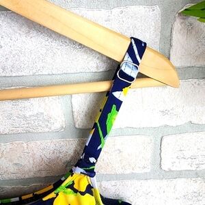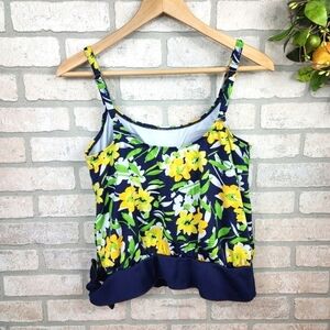 The tankini has a built-in bra with elastic, adjustable straps and a tie at the bottom for design with a bright floral pattern throughout. Excellent condition.