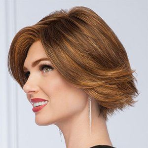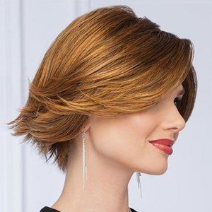New in box with tags. Dare to Flair has razor cut lengths creating a textured shape to this free-form bob cut. Average size cap with a SHEER LACE FRONT for off the face styling, and a 100% HAND-TIED MONOFILAMENT TOP that gives an incredibly natural hairline and can be parted in any direction. A very, very versatile piece from Gabor's Luxury Collection. She goes from office casual to sleek chic to stunning glamour with ease. With velvet-lined ear tabs and a velvet-lined extended nape, along with ultra-thin adjusters at the nape to assure a comfortable, secure fit. Shade GL14-16 Honey Toast is s dark blonde blend with golden highlights. MSRP $239.00 USD